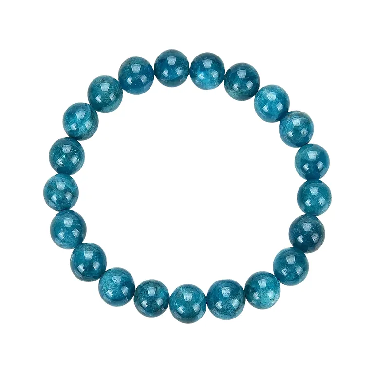 Apatit Armband stabilisiert aus sorgfältig geschliffenen 09–10 mm Kugeln überzeugt durch seine kraftvolle Optik und die gleichmäßige, polierte Oberfläche. Die Stabilisierung des Apatits sorgt für eine intensive Farbwirkung und erhöht die Widerstandsfähigkeit des Edelsteins.